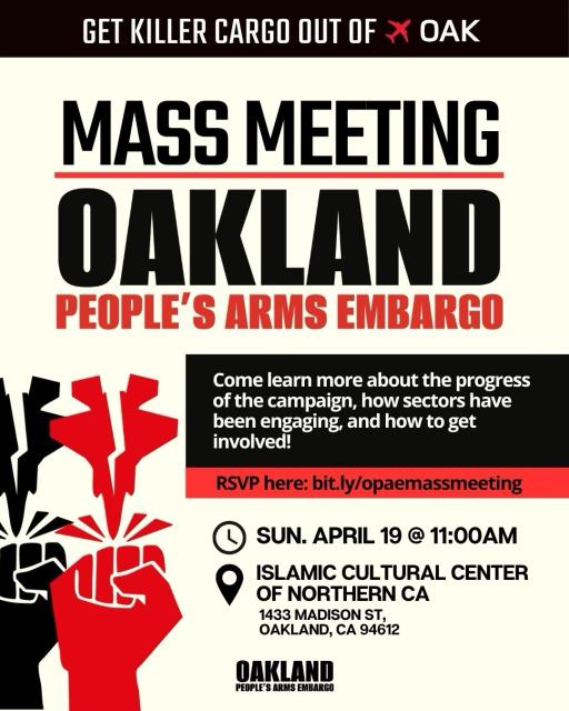 On Sunday the 19th, the People’s Arms Embargo will hold a mass meeting at 11 a.m. at the Islamic Cultural Center, 1433 Madison St., Oakland.