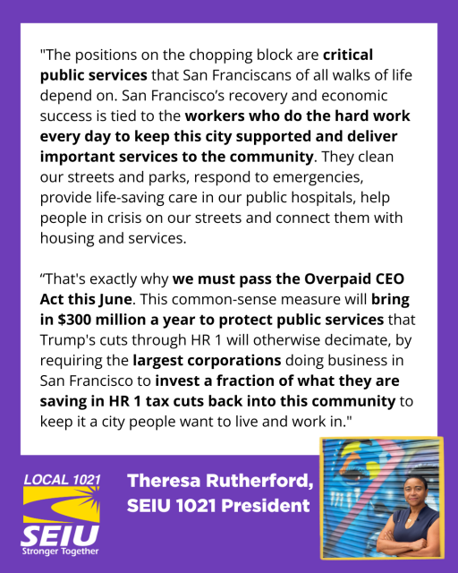 “That’s exactly why we must pass the Overpaid CEO Act this June. This common-sense measure will bring in $300 million a year to protect public services that Trump’s cuts through HR 1 will otherwise decimate, by requiring the largest corporations doing business in San Francisco to invest a fraction of what they are saving in HR 1 tax cuts back into this community to keep it a city people want to live and work in.”