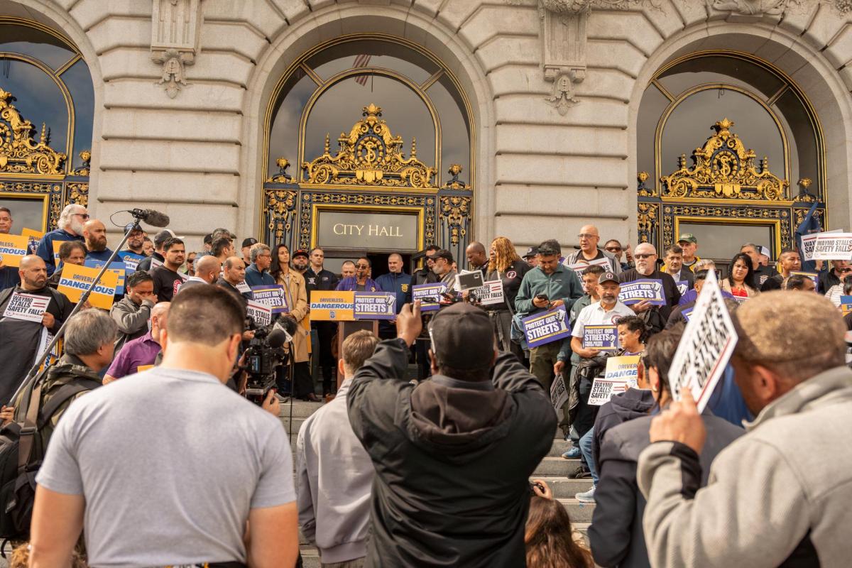 Monday, March 2, Uber and Lyft drivers united in California Gig Workers Union, along with freight and delivery members of Teamsters Joint Council 7, San Francisco Firefighters, and SEIU 1021 SF City & County members, held a rally demanding Waymos be taken off the road until public safety concerns are adequately addressed.