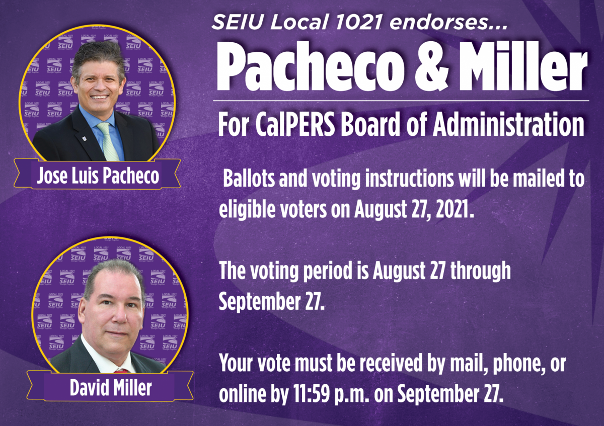 That is all to say; it is all the more decisive why retirees, active public employees, all CalPERS members participate by voting in the upcoming election. We have two labor-backed candidates, David Miller and Jose Luis Pacheco, running for CalPERS Board of Administration. Miller is running for re-election to the At-Large Seat A, and Pacheco is running for At-Large Seat B. Both candidates come from labor. Miller is a union leader of the California Association of Professional Scientists. Pacheco is the president of the California School Employees Association, Chapter 363.”