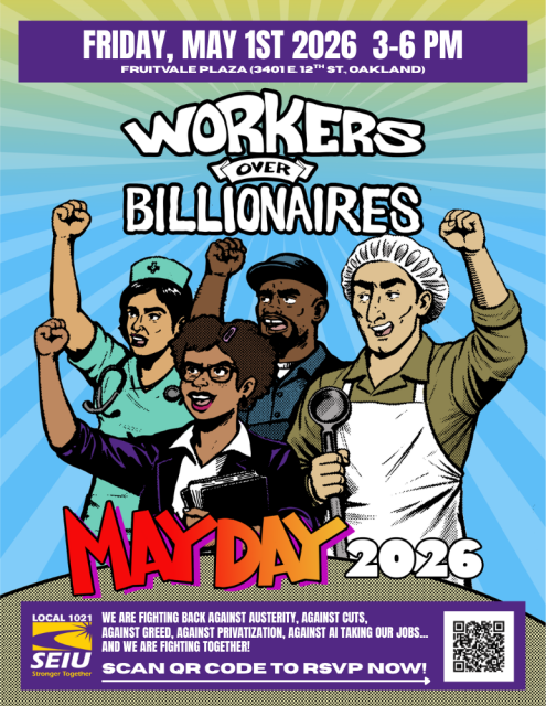Join SEIU 1021, our fellow unions, and allied organizations for May Day on Friday, May 1, to show the billionaire class that workers have the powers and we are fighting back against austerity, against cuts, against greed, against privatization, against AI taking our jobs… and we are fighting together! Gather at Fruitvale Plaza (3401 E. 12th St., Oakland) to rally at 3 p.m. and march from 4 to 6 p.m.