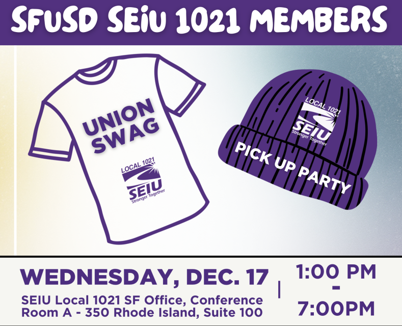 SFUSD member swag pick-up party – Dec. 17, 2025 RSVP by December 12 at 5:00 pm! Webform December 17, 2025 - 1:00pm - 7:00pm Calling all SEIU 1021 SFUSD education members! What: Please join us for a member swag pick-up & union update party! Food will be provided. When: Stop by on Wednesday, December 17, between 1:00 p.m. and 7:00 p.m. Where: 350 Rhode Island, Suite 100, San Francisco, CA 94103 RSVP deadline: FRIDAY, December 12, 5:00 p.m. First name: * Last name: * Classification: * Personal email: * Cell phone: By providing your cell phone number, you consent to receive occasional text messages from SEIU 1021. We will never charge you, but your carrier’s standard data rates may apply. You may opt out at any time by replying STOP.