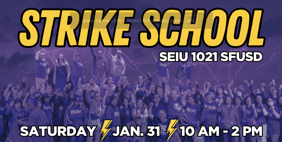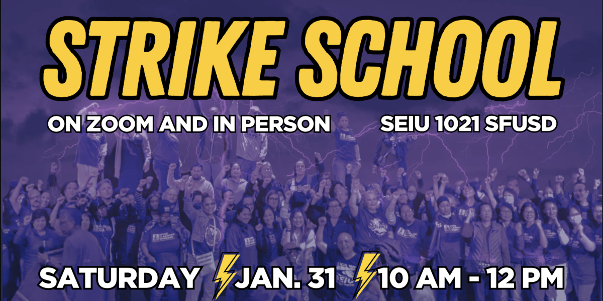 Please join fellow SFUSD SEIU 1021 classified professionals on Saturday, January 31, at 10:00 a.m. via Zoom -or- at the SEIU 1021 San Francisco union hall at 350 Rhode Island, suite 100, for information on your right to strike and how to stand in solidarity with other striking unions.